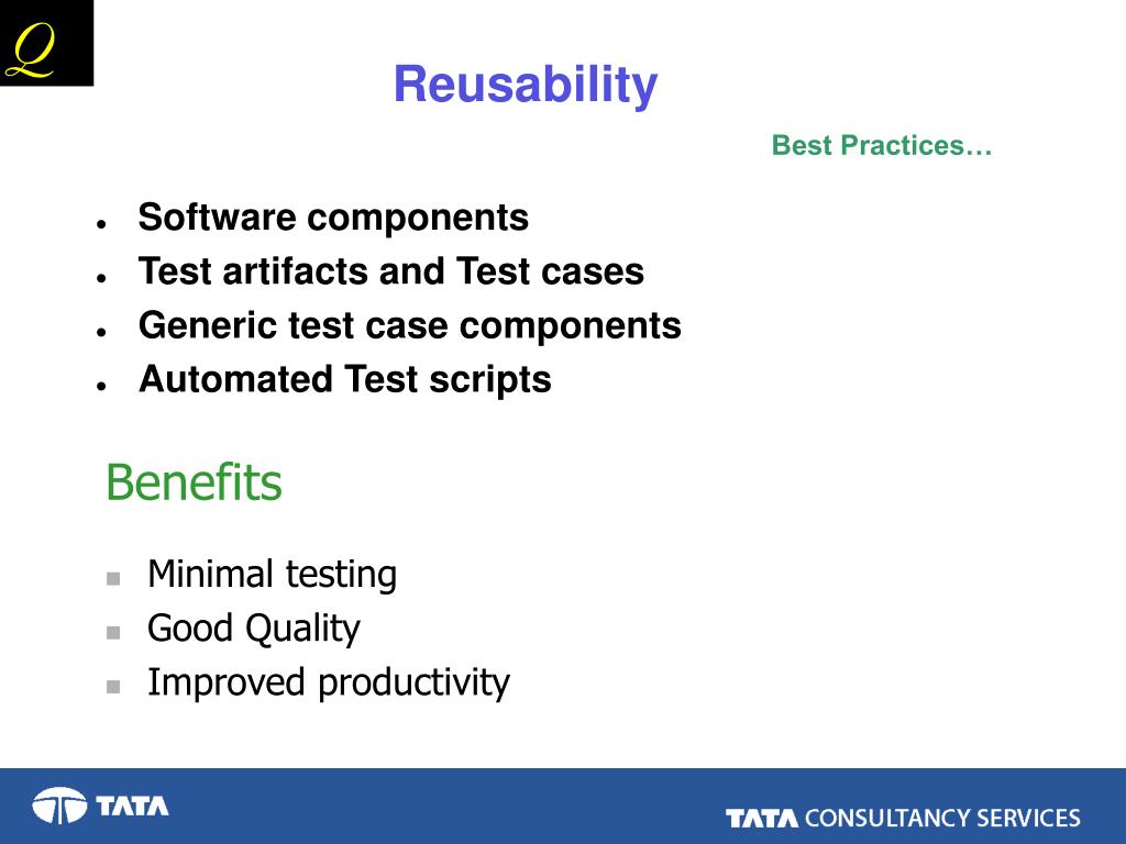Software components Test artifacts and Test cases Generic test case components Automated Test scripts Reusability Best Practices… Benefits • Minimal testing • Good Quality • Improved productivity