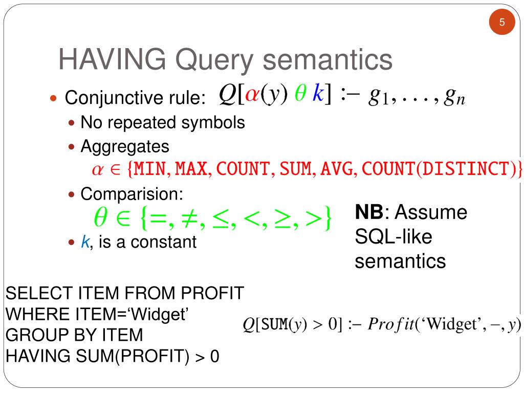 Conjunctive rule: • No repeated symbols • Aggregates • Comparision: • k, is a constant HAVING Query semantics NB: Assume SQL-like semantics SELECT ITEM FROM PROFIT WHERE ITEM=‘Widget’ GROUP BY ITEM HAVING SUM(PROFIT) > 0