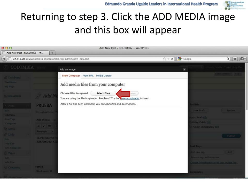 Important Considerations • With the previous command you can upload images and documents onto the IIHR (word, pdf, excel) • To upload photos, you need to activate the option INSERT POST or INSERT PAGE • When you upload documents, you need to copy the link and must do two additional steps