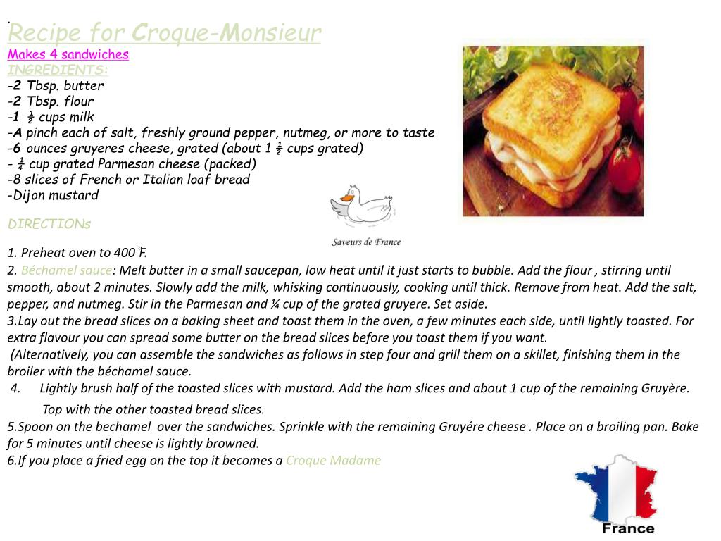 . • Recipe for Croque-Monsieur • Makes 4 sandwiches • INGREDIENTS: • -2 Tbsp. butter • -2 Tbsp. flour • -1 ½ cups milk • -A pinch each of salt, freshly ground pepper, nutmeg, or more to taste • -6 ounces gruyeres cheese, grated (about 1 ½ cups grated) • - ¼ cup grated Parmesan cheese (packed) • -8 slices of French or Italian loaf bread • Dijon mustard • DIRECTIONs • Preheat oven to 400°F. • Béchamel sauce: Melt butter in a small saucepan, low heat until it just starts to bubble. Add the flour , stirring until smooth, about 2 minutes. Slowly add the milk, whisking continuously, cooking until thick. Remove from heat. Add the salt, pepper, and nutmeg. Stir in the Parmesan and ¼ cup of the grated gruyere. Set aside. • Lay out the bread slices on a baking sheet and toast them in the oven, a few minutes each side, until lightly toasted. For extra flavour you can spread some butter on the bread slices before you toast them if you want. • (Alternatively, you can assemble the sandwiches as follows in step four and grill them on a skillet, finishing them in the broiler with the béchamel sauce. • 4. Lightly brush half of the toasted slices with mustard. Add the ham slices and about 1 cup of the remaining Gruyère. • Top with the other toasted bread slices. • Spoon on the bechamel over the sandwiches. Sprinkle with the remaining Gruyére cheese . Place on a broiling pan. Bake for 5 minutes until cheese is lightly browned. • If you place a fried egg on the top it becomes a Croque Madame