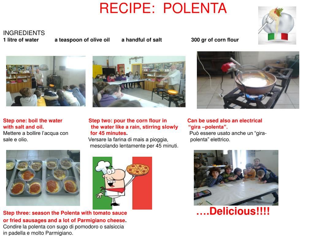 RECIPE: POLENTA INGREDIENTS 1 litre of water a teaspoon of olive oil a handful of salt 300 gr of corn flour Step one: boil the water Step two: pour the corn flour in Can be used also an electrical with salt and oil. the water like a rain, stirring slowly “gira –polenta”. Mettere a bollire l’acqua con for 45 minutes. Può essere usato anche un “gira- sale e olio. Versare la farina di mais a pioggia, polenta” elettrico. mescolando lentamente per 45 minuti. Step three: season the Polenta with tomato sauce ….Delicious!!!! or fried sausages and a lot of Parmigiano cheese. Condire la polenta con sugo di pomodoro o salsiccia in padella e molto Parmigiano.