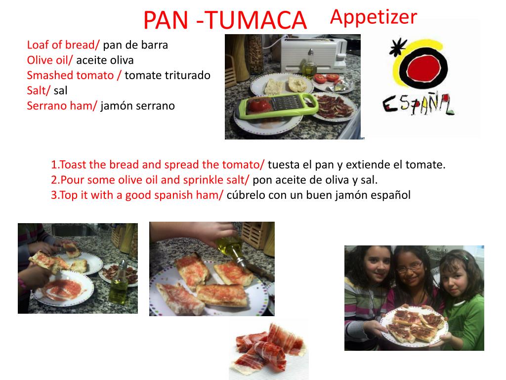 PAN -TUMACA Appetizer Loaf of bread/ pan de barra Olive oil/ aceite oliva Smashed tomato / tomate triturado Salt/ sal Serrano ham/ jamón serrano 1.Toast the bread and spread the tomato/ tuesta el pan y extiende el tomate. 2.Pour some olive oil and sprinkle salt/ pon aceite de oliva y sal. 3.Top it with a good spanish ham/ cúbrelo con un buen jamón español