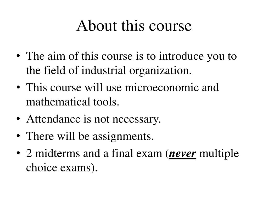 Aboutthiscourse • Theaim of thiscourse is tointroduceyoutothefield of industrialorganization. • Thiscoursewillusemicroeconomicandmathematicaltools. • Attendance is not necessary. • Therewillbe assignments. • 2 midtermsand a final exam (nevermultiplechoiceexams).