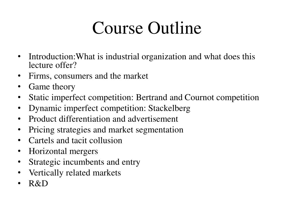 CourseOutline • Introduction:What is industrial organization and what does this lecture offer? • Firms, consumers and the market • Game theory • Static imperfect competition: Bertrand and Cournot competition • Dynamic imperfect competition: Stackelberg • Product differentiation and advertisement • Pricing strategies and market segmentation • Cartels and tacit collusion • Horizontal mergers • Strategic incumbents and entry • Vertically related markets • R&D