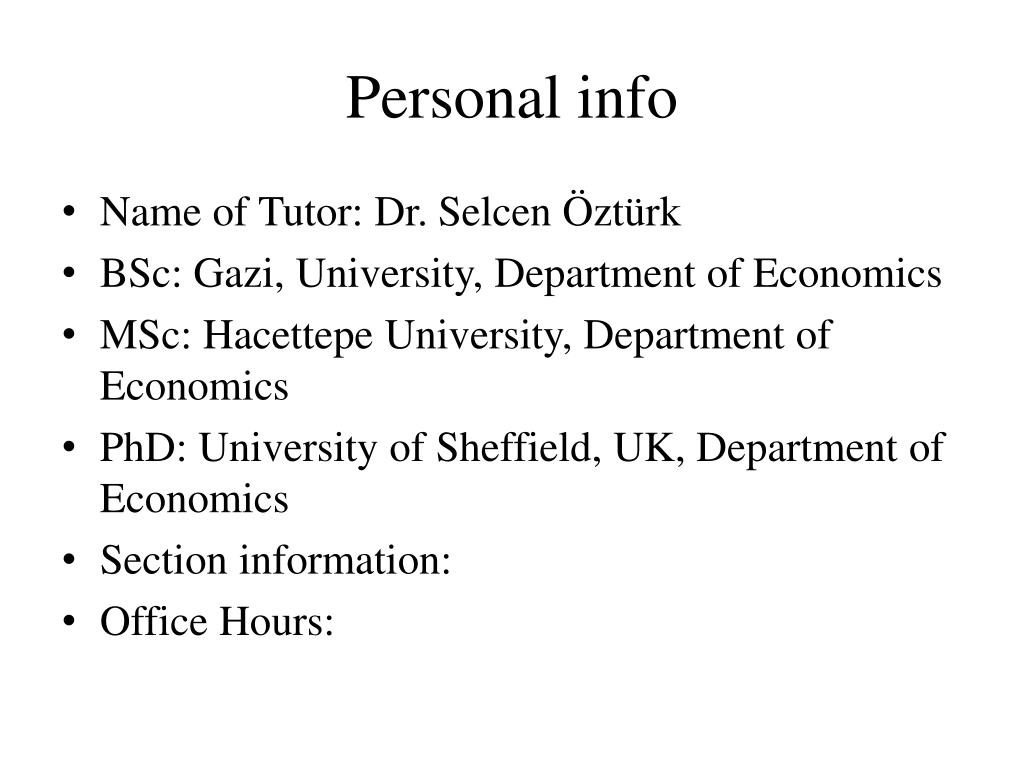 Personalinfo • Name of Tutor: Dr. SelcenÖztürk • BSc: Gazi, University, Department of Economics • MSc: Hacettepe University, Department of Economics • PhD: University of Sheffield, UK, Department of Economics • Section information: • Office Hours:
