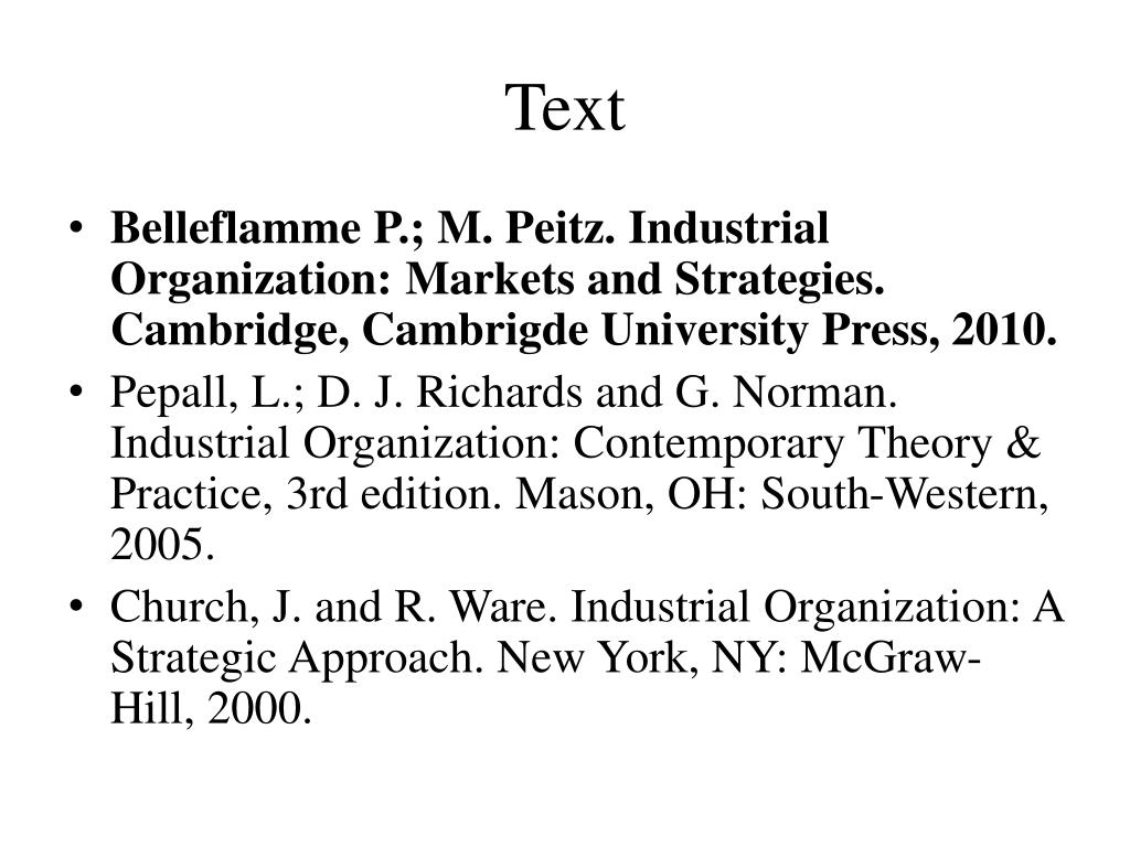 Text • Belleflamme P.; M. Peitz. Industrial Organization: Markets and Strategies. Cambridge, Cambrigde University Press, 2010. • Pepall, L.; D. J. Richards and G. Norman. Industrial Organization: Contemporary Theory & Practice, 3rd edition. Mason, OH: South-Western, 2005. • Church, J. and R. Ware. Industrial Organization: A Strategic Approach. New York, NY: McGraw-Hill, 2000.