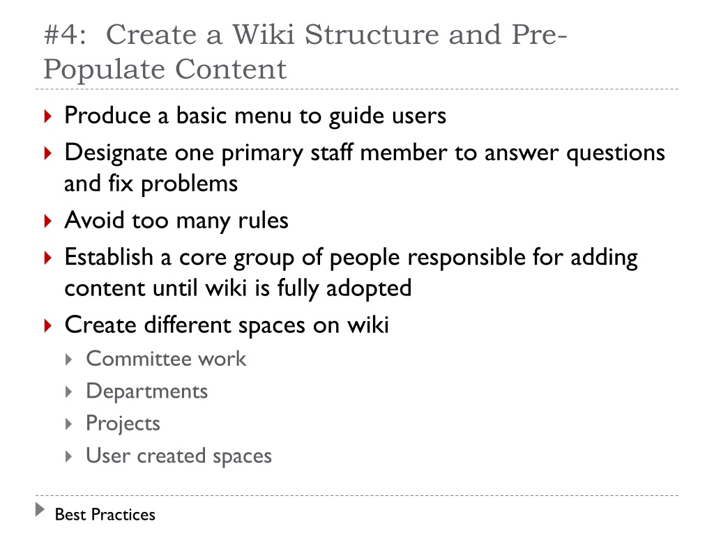 #4: Create a Wiki Structure and Pre-Populate Content • Produce a basic menu to guide users • Designate one primary staff member to answer questions and fix problems • Avoid too many rules • Establish a core group of people responsible for adding content until wiki is fully adopted • Create different spaces on wiki • Committee work • Departments • Projects • User created spaces Best Practices