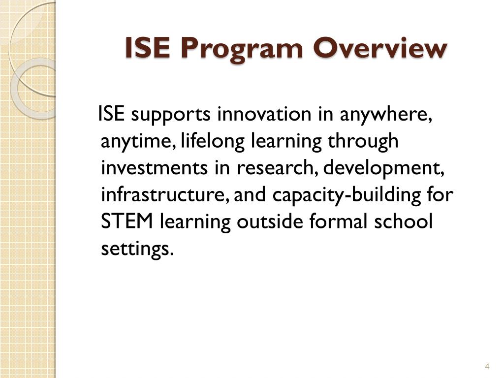 ISE supports innovation in anywhere, anytime, lifelong learning through investments in research, development, infrastructure, and capacity-building for STEM learning outside formal school settings. ISE Program Overview