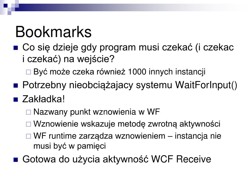 Bookmarks • Co się dzieje gdy program musi czekać (i czekac i czekać) na wejście? • Być może czeka również 1000 innych instancji • Potrzebny nieobciążajacy systemu WaitForInput() • Zakładka! • Nazwany punkt wznowienia w WF • Wznowienie wskazuje metodę zwrotną aktywności • WF runtime zarządza wznowieniem – instancja nie musi być w pamięci • Gotowa do użycia aktywność WCF Receive