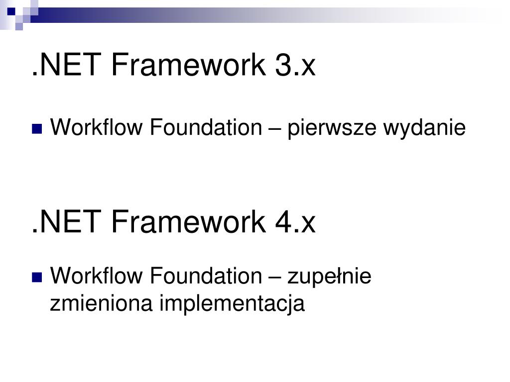 .NET Framework 3.x • Workflow Foundation – pierwsze wydanie .NET Framework 4.x • Workflow Foundation – zupełnie zmieniona implementacja