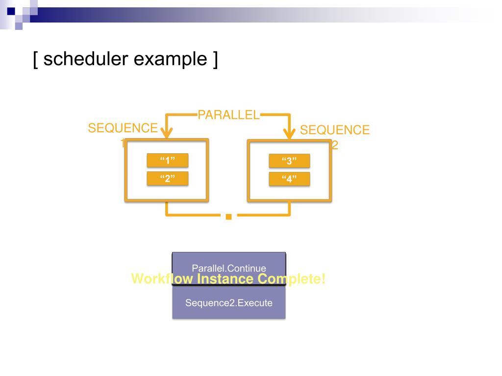 [ scheduler example ] PARALLEL SEQUENCE1 SEQUENCE2 “1” “3” “2” “4” ■ Parallel.Execute Sequence1.Execute Write(“1”).Execute Write(“2”).Execute Sequence1.Continue Parallel.Continue Write(“4”).Execute Sequence2.Execute Write(“3”).Execute Sequence2.Continue Sequence2.Continue Parallel.Continue Sequence1.Continue Workflow Instance Complete! Sequence2.Execute