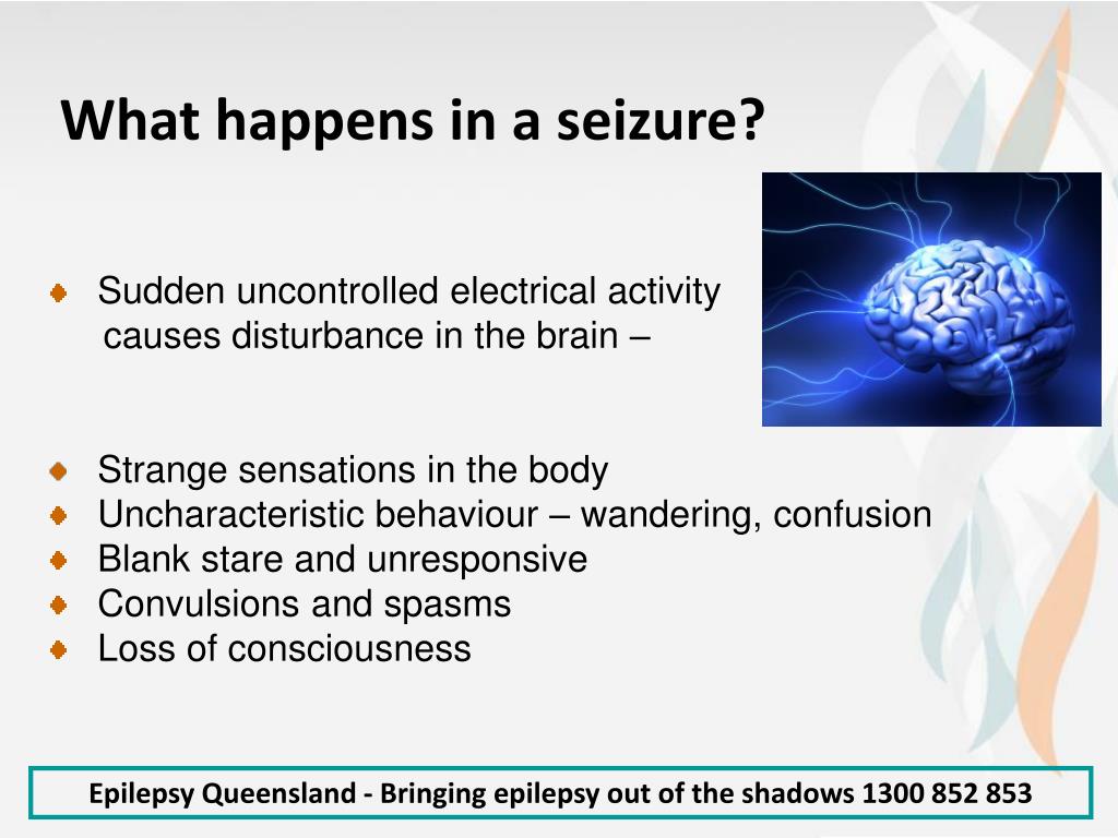 What happens in a seizure? Sudden uncontrolled electrical activity causes disturbance in the brain – Strange sensations in the body Uncharacteristic behaviour – wandering, confusion Blank stare and unresponsive Convulsions and spasms Loss of consciousness Epilepsy Queensland - Bringing epilepsy out of the shadows 1300 852 853