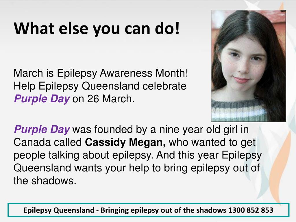 What else you can do! March is Epilepsy Awareness Month! Help Epilepsy Queensland celebrate Purple Day on 26 March. Purple Day was founded by a nine year old girl in Canada called Cassidy Megan, who wanted to get people talking about epilepsy. And this year Epilepsy Queensland wants your help to bring epilepsy out of the shadows. Epilepsy Queensland - Bringing epilepsy out of the shadows 1300 852 853