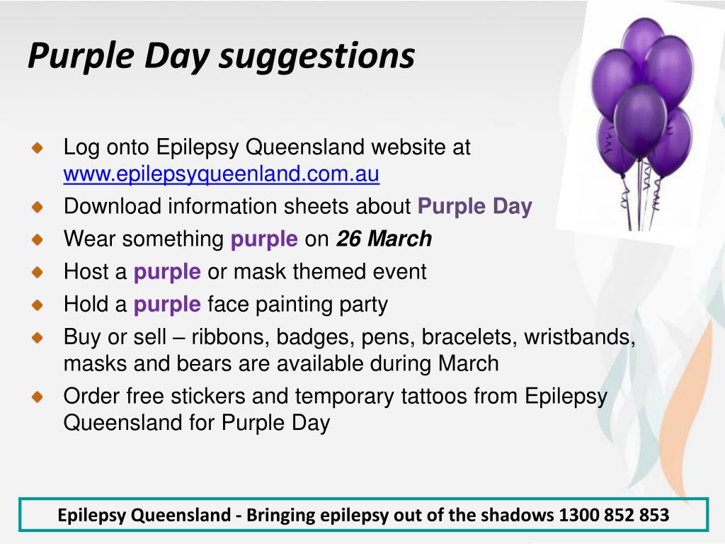 Purple Day suggestions Log onto Epilepsy Queensland website at www.epilepsyqueenland.com.au Download information sheets about Purple Day Wear somethingpurpleon 26 March Host a purple or mask themed event Hold apurpleface painting party Buy or sell – ribbons, badges, pens, bracelets, wristbands, masks and bears are available during March Orderfree stickers and temporary tattoos from Epilepsy Queensland for Purple Day Epilepsy Queensland - Bringing epilepsy out of the shadows 1300 852 853