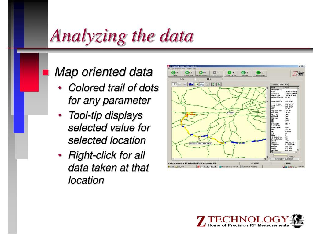 Analyzing the data • Map oriented data • Colored trail of dots for any parameter • Tool-tip displays selected value for selected location • Right-click for all data taken at that location