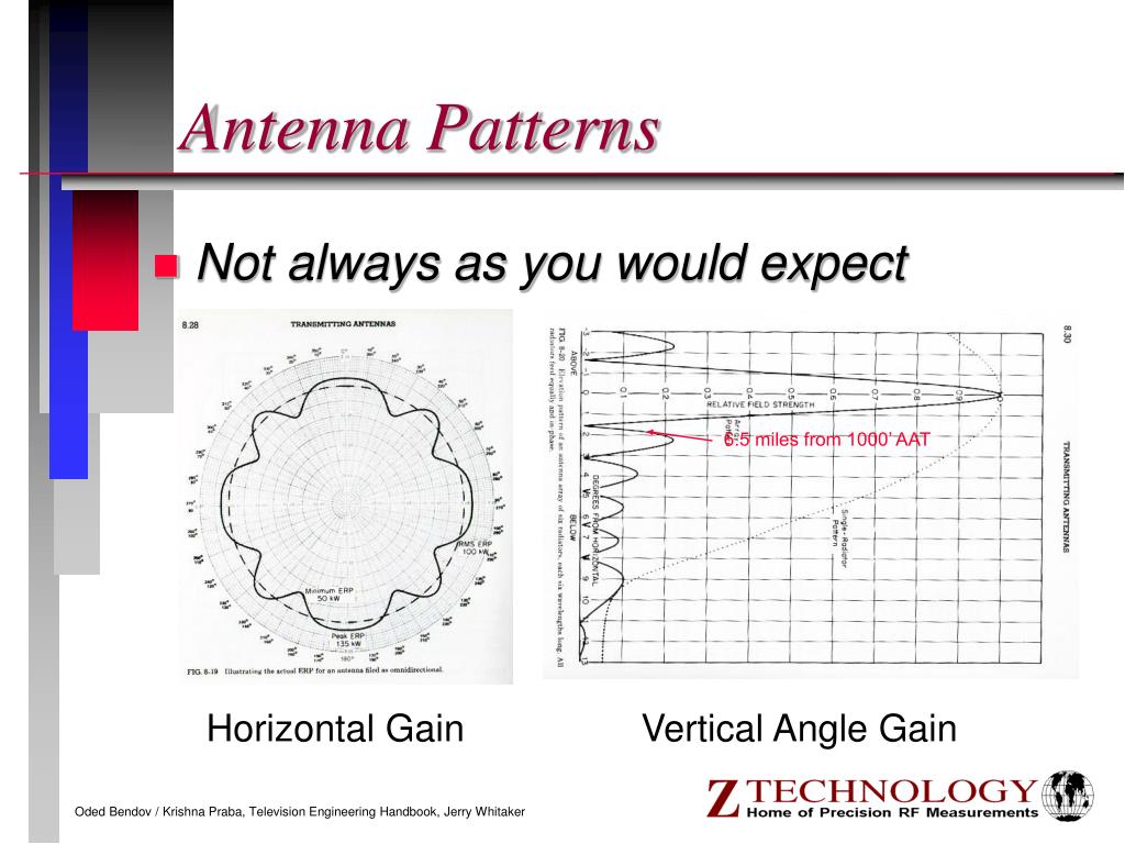 Antenna Patterns • Not always as you would expect 6.5 miles from 1000’ AAT Horizontal Gain Vertical Angle Gain Oded Bendov / Krishna Praba, Television Engineering Handbook, Jerry Whitaker