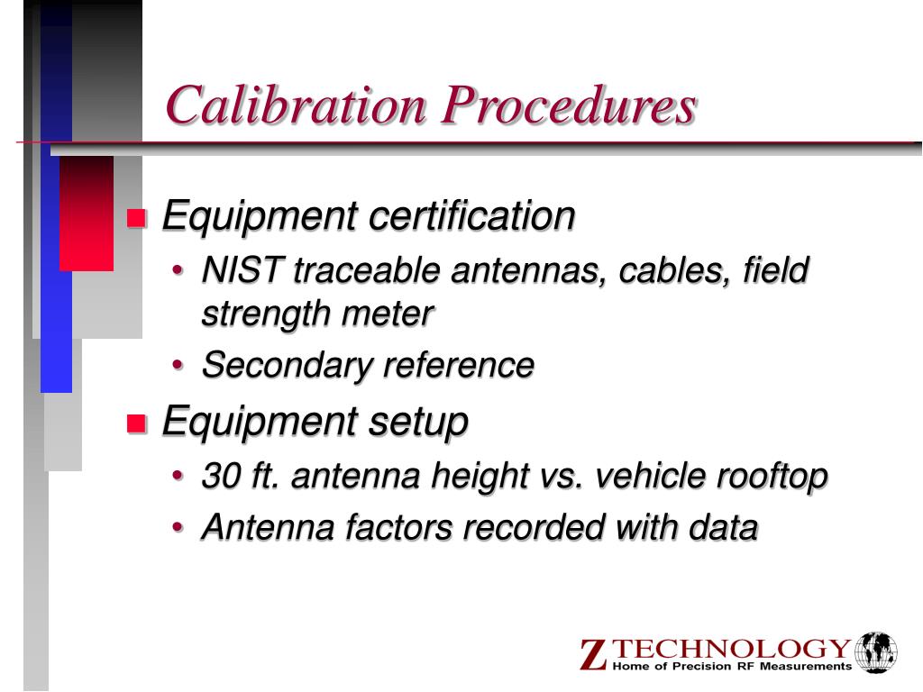 Calibration Procedures • Equipment certification • NIST traceable antennas, cables, field strength meter • Secondary reference • Equipment setup • 30 ft. antenna height vs. vehicle rooftop • Antenna factors recorded with data