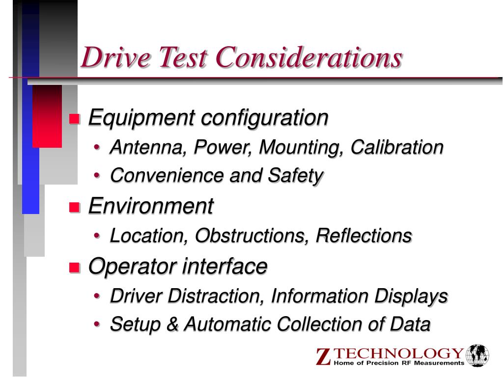 Drive Test Considerations • Equipment configuration • Antenna, Power, Mounting, Calibration • Convenience and Safety • Environment • Location, Obstructions, Reflections • Operator interface • Driver Distraction, Information Displays • Setup & Automatic Collection of Data