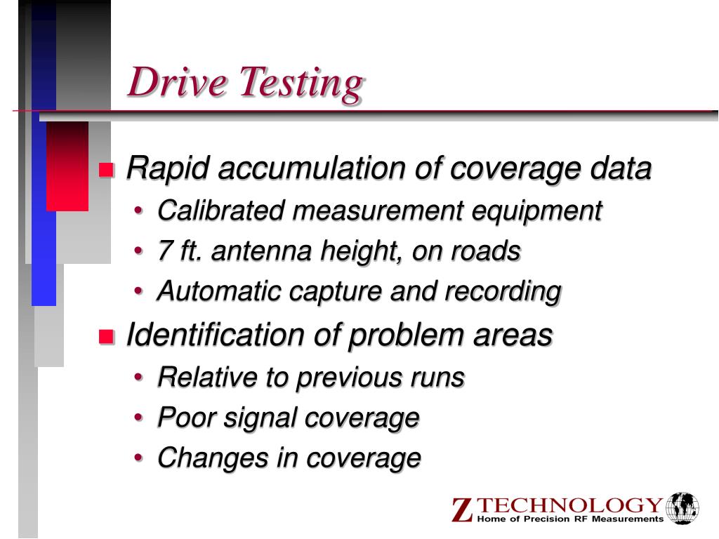 Drive Testing • Rapid accumulation of coverage data • Calibrated measurement equipment • 7 ft. antenna height, on roads • Automatic capture and recording • Identification of problem areas • Relative to previous runs • Poor signal coverage • Changes in coverage