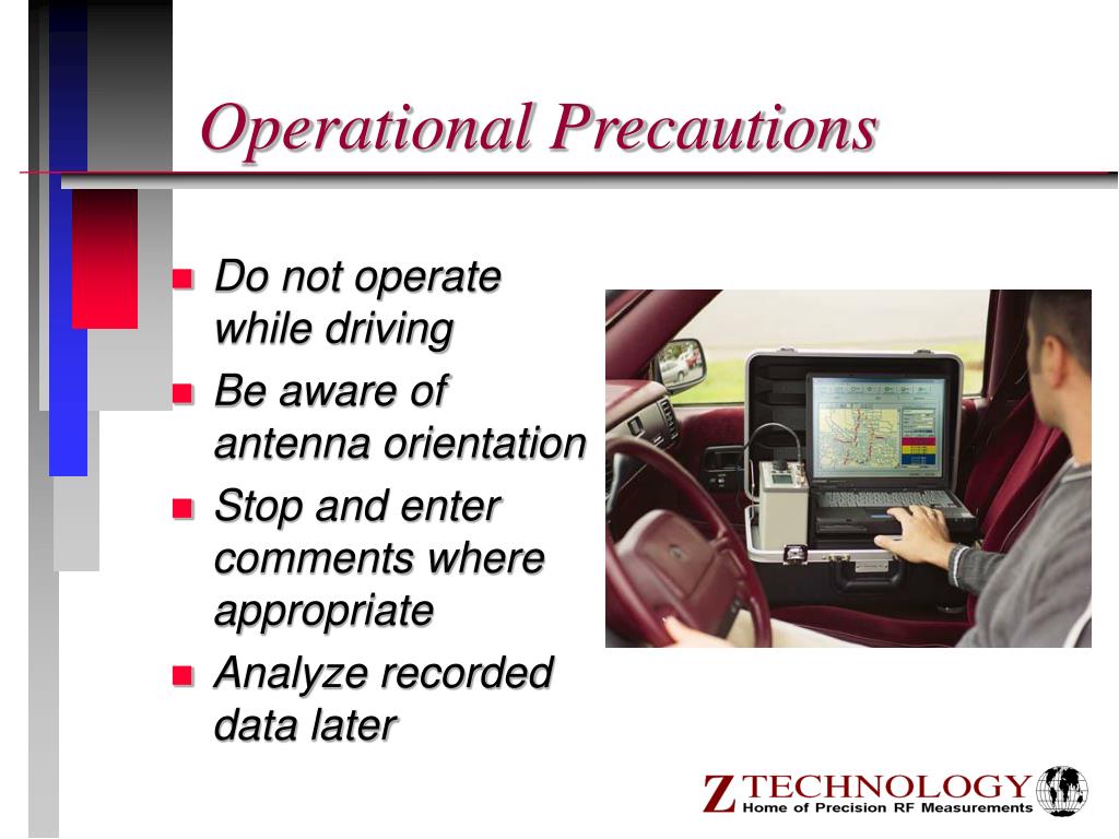 Operational Precautions • Do not operate while driving • Be aware of antenna orientation • Stop and enter comments where appropriate • Analyze recorded data later