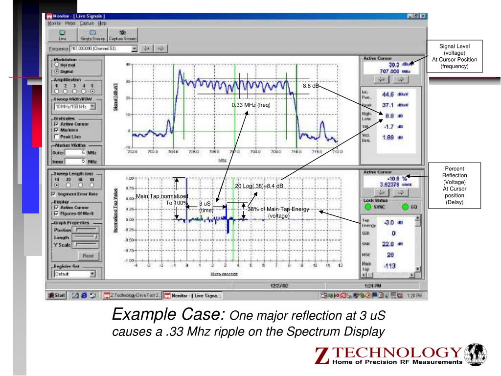 Signal Level (voltage) At Cursor Position (frequency) 8.8 dB 0.33 MHz (freq) Percent Reflection (Voltage) At Cursor position (Delay) 20 Log(.38)=8.4 dB Main Tap normalized To 100% 3 uS (time) 38% of Main Tap Energy (voltage) Example Case: One major reflection at 3 uS causes a .33 Mhz ripple on the Spectrum Display