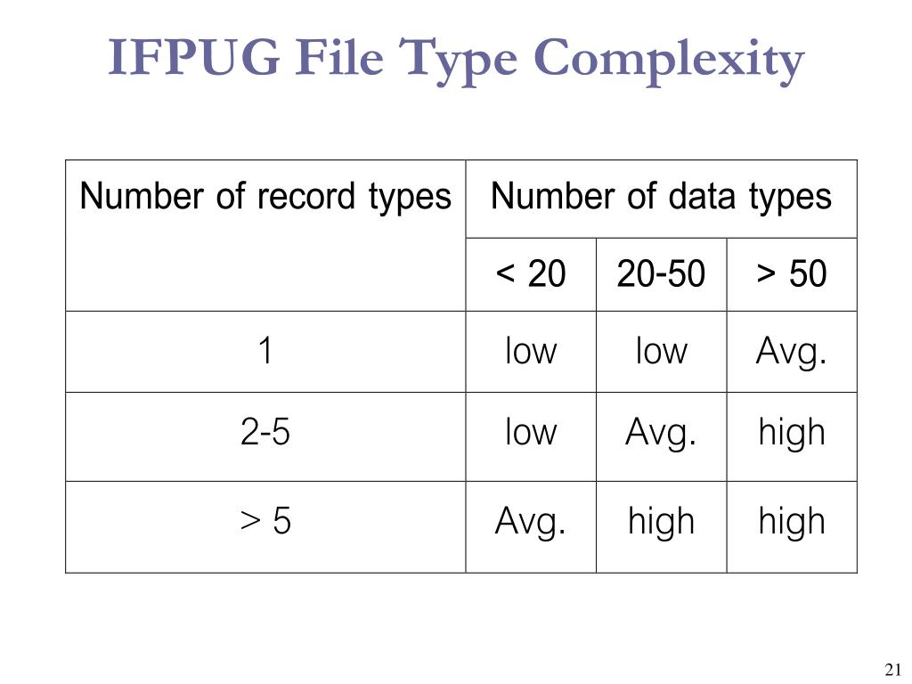 Function Points • Logical Internal File Types • Simple: few record types, few data element types, no significant performance or recovery considerations. • Average: is not clearly either simple or complex • Complex: many record types, many data element types, performance and recovery are significant considerations.