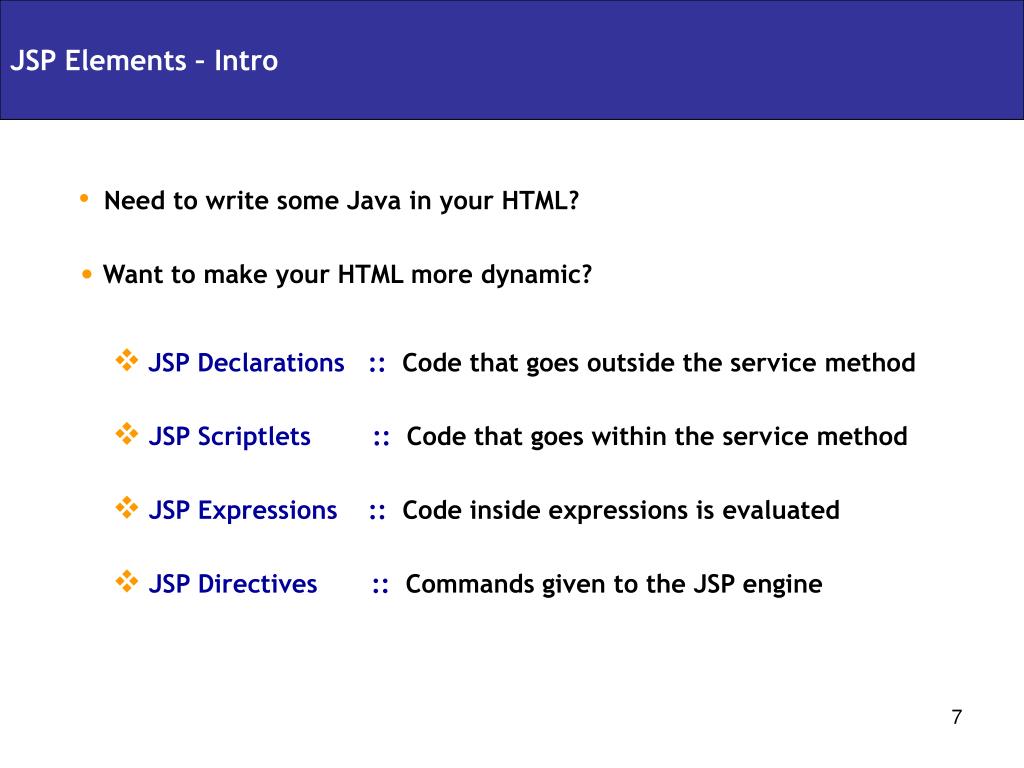 JSP Elements – Intro • Need to write some Java in your HTML? • Want to make your HTML more dynamic? • JSP Declarations :: Code that goes outside the service method • JSP Scriptlets :: Code that goes within the service method • JSP Expressions :: Code inside expressions is evaluated • JSP Directives :: Commands given to the JSP engine