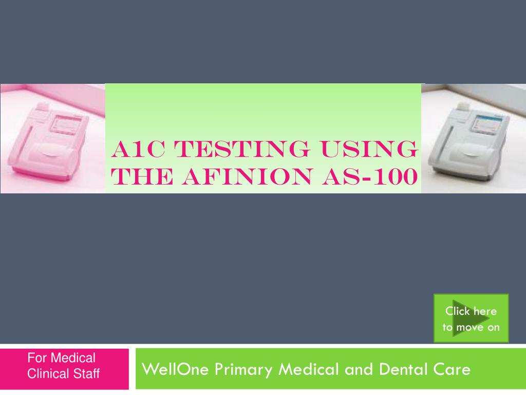 A1C Testing USING THE Afinion AS-100. Click here to move on. For Medical Clinical Staff. WellOne Primary Medical and Dental Care. WARNING. Click here to go back. Click here to move on.