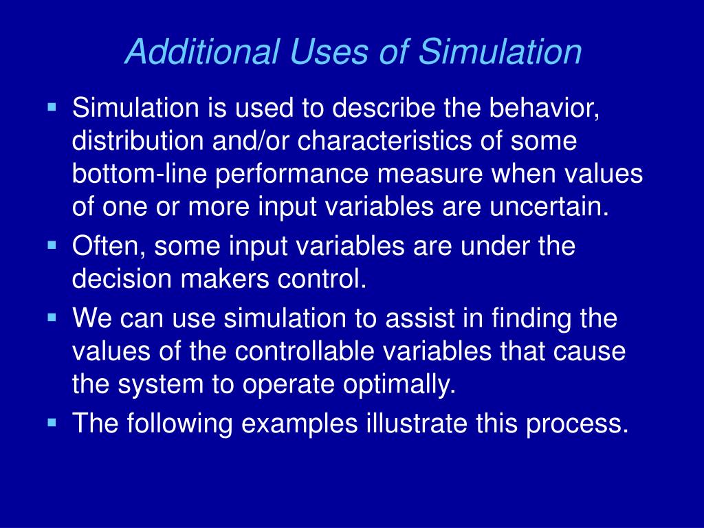 Additional Uses of Simulation • Simulation is used to describe the behavior, distribution and/or characteristics of some bottom-line performance measure when values of one or more input variables are uncertain. • Often, some input variables are under the decision makers control. • We can use simulation to assist in finding the values of the controllable variables that cause the system to operate optimally. • The following examples illustrate this process.