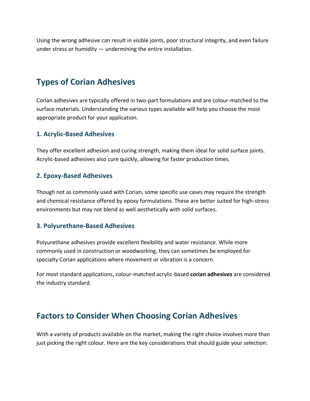 Using the wrong adhesive can result in visible joints, poor structural integrity, and even failure under stress or humidity — undermining the entire installation. Types of Corian Adhesives Corian adhesives are typically offered in two-part formulations and are colour-matched to the surface materials. Understanding the various types available will help you choose the most appropriate product for your application. 1. Acrylic-Based Adhesives They offer excellent adhesion and curing strength, making them ideal for solid surface joints. Acrylic-based adhesives also cure quickly, allowing for faster production times. 2. Epoxy-Based Adhesives Though not as commonly used with Corian, some specific use cases may require the strength and chemical resistance offered by epoxy formulations. These are better suited for high-stress environments but may not blend as well aesthetically with solid surfaces. 3. Polyurethane-Based Adhesives Polyurethane adhesives provide excellent flexibility and water resistance. While more commonly used in construction or woodworking, they can sometimes be employed for specialty Corian applications where movement or vibration is a concern. For most standard applications, colour-matched acrylic-based corian adhesives are considered the industry standard. Factors to Consider When Choosing Corian Adhesives With a variety of products available on the market, making the right choice involves more than just picking the right colour. Here are the key considerations that should guide your selection: