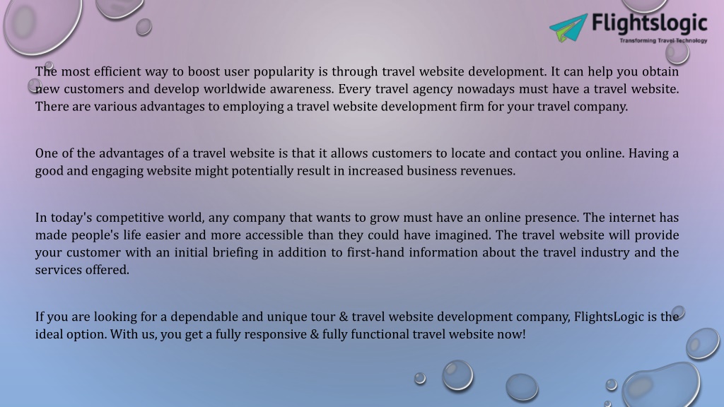 FlightsLogic provides the Best Travel Website Development Services And Travel Agency Website to travel companies all over the globe. FlightsLogic is a well-known Travel Website Development Company, and our primary goal is to create high-quality bespoke travel websites that use the latest technology. While creating a website that is accessible to all users, we adhere to all current technologies. For more details, please visit our website:<br>https://www.flightslogic.com/best-travel-websites.php