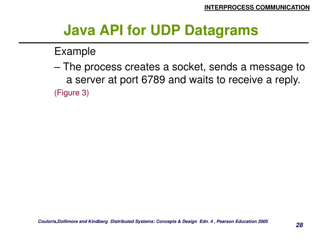 Java API for UDP Datagrams Figure 3. UDP client sends a message to the server and gets a reply Couloris,Dollimore and Kindberg Distributed Systems: Concepts & Design Edn. 4 , Pearson Education 2005