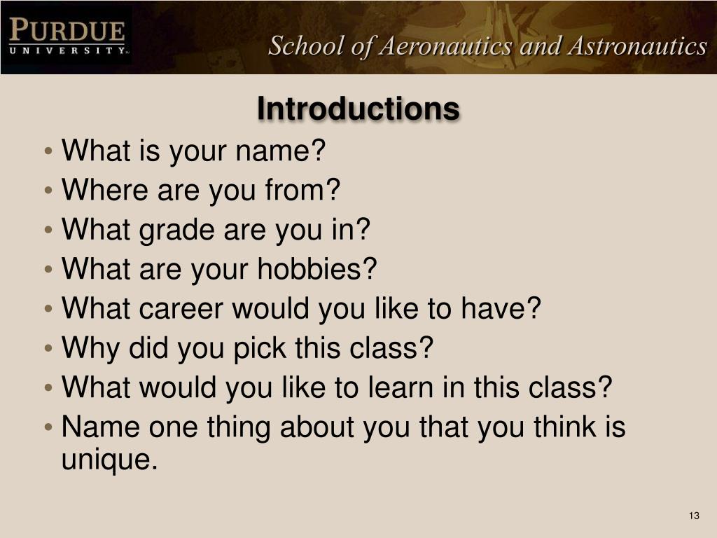 Introductions • What is your name? • Where are you from? • What grade are you in? • What are your hobbies? • What career would you like to have? • Why did you pick this class? • What would you like to learn in this class? • Name one thing about you that you think is unique.