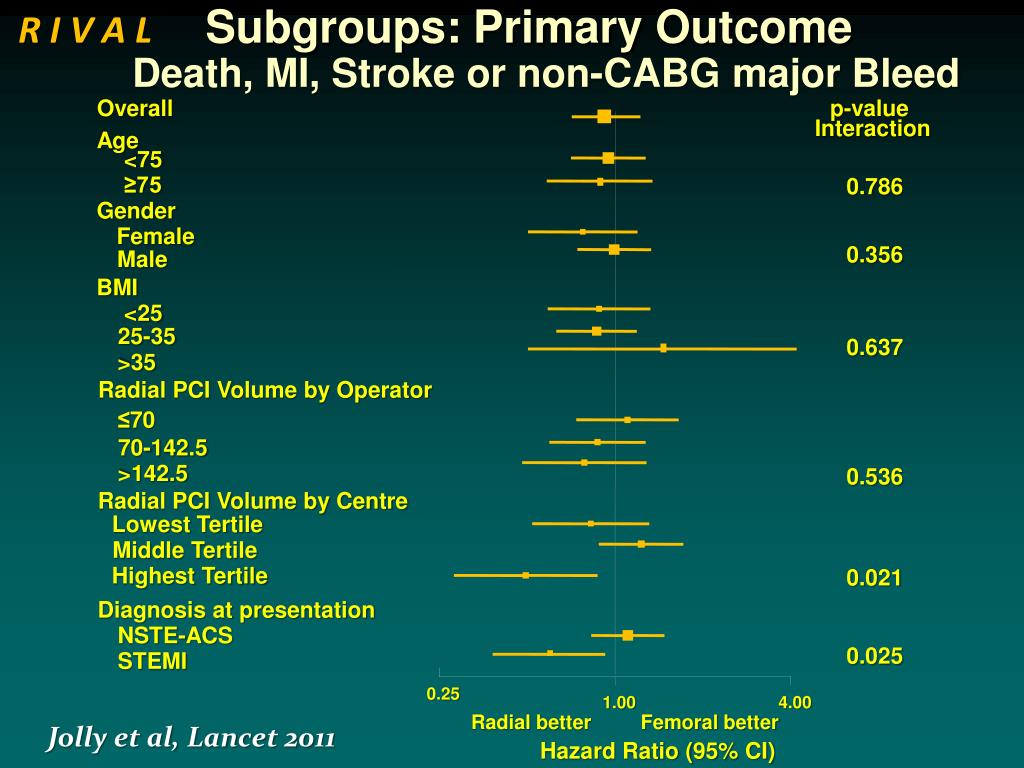 Subgroups: Primary Outcome R I V A L Death, MI, Stroke or non-CABG major Bleed Overall p-value Interaction Age <75 ≥75 0.786 Gender Female 0.356 Male BMI <25 25-35 0.637 >35 Radial PCI Volume by Operator ≤70 70-142.5 >142.5 0.536 Radial PCI Volume by Centre Lowest Tertile Middle Tertile Highest Tertile 0.021 Diagnosis at presentation NSTE-ACS 0.025 STEMI 0.25 1.00 4.00 Radial better Femoral better Jolly et al, Lancet 2011 Hazard Ratio (95% CI)