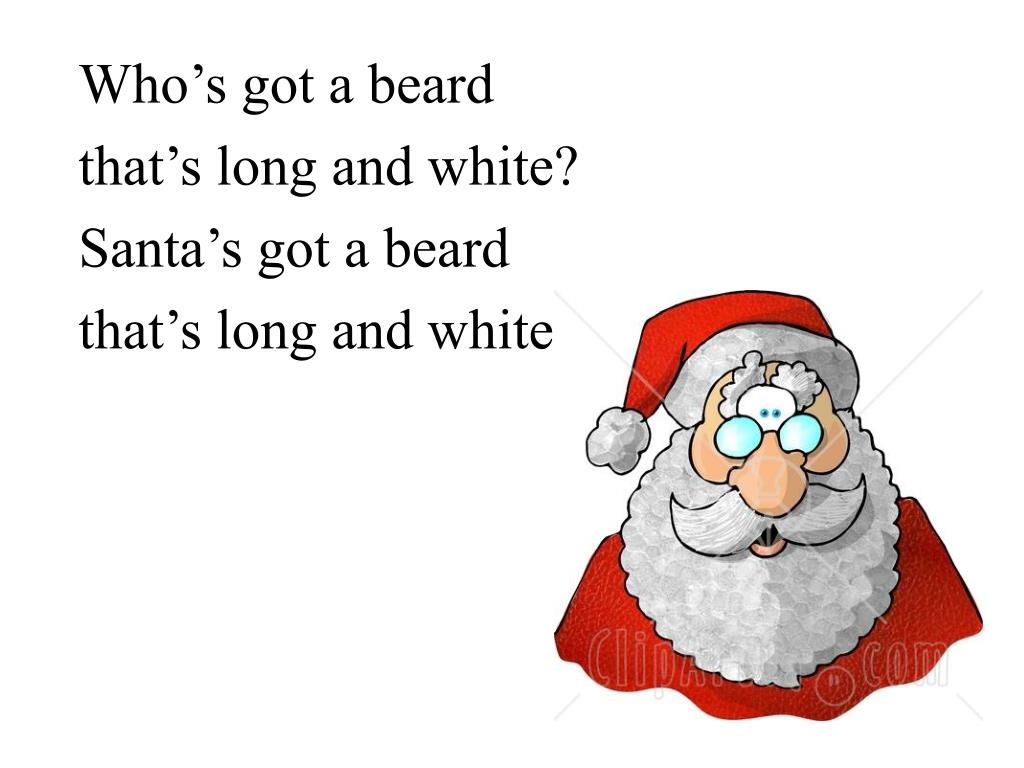 Who’s got a beard that’s long and white? Santa’s got a beard that’s long and white.