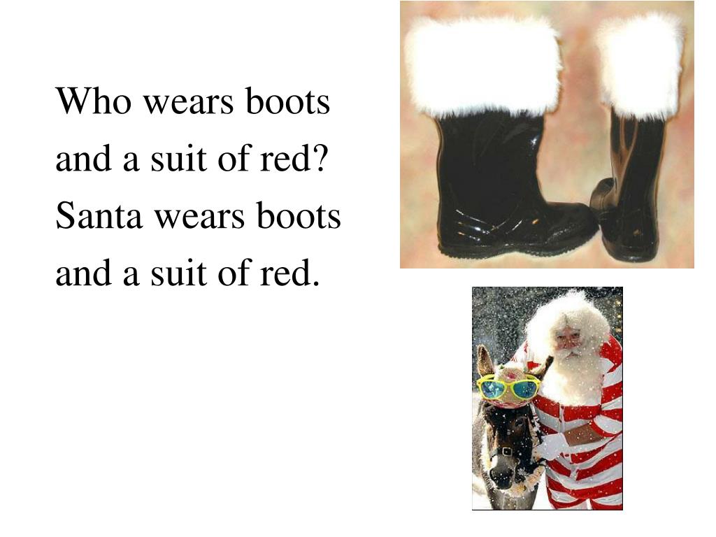 Who wears boots and a suit of red? Santa wears boots and a suit of red.