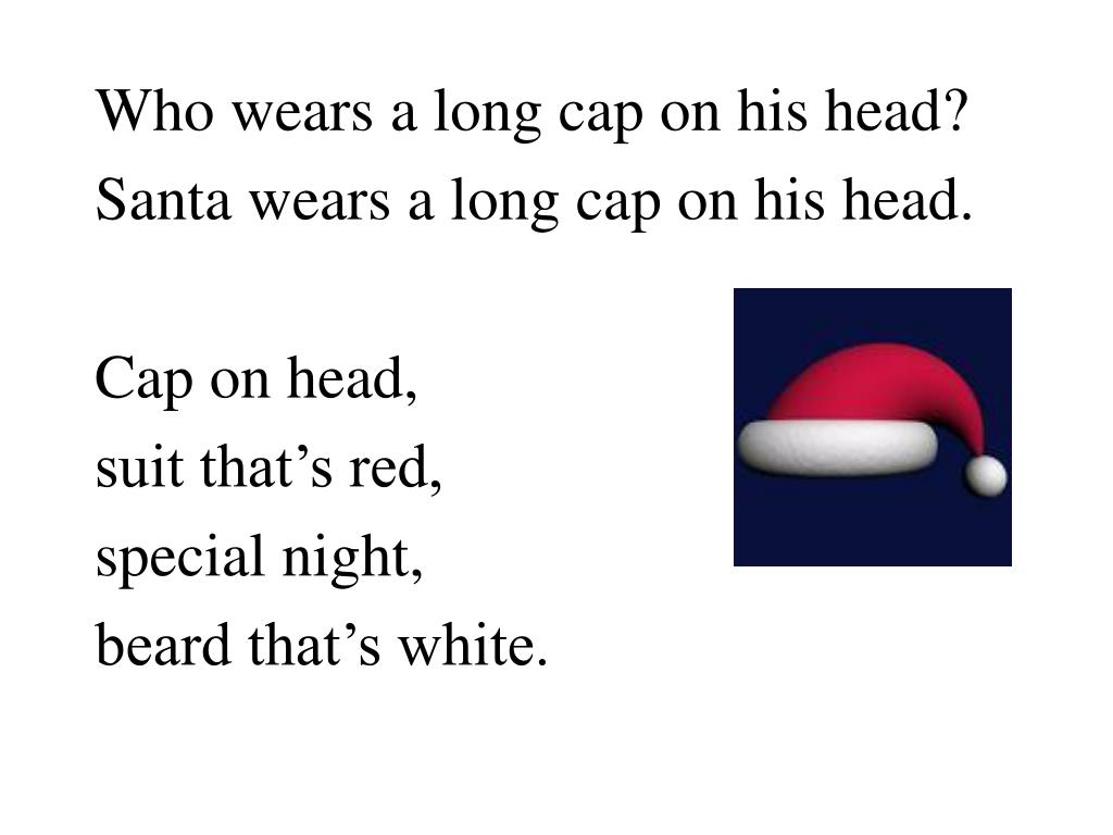 Who wears a long cap on his head? Santa wears a long cap on his head. Cap on head, suit that’s red, special night, beard that’s white.