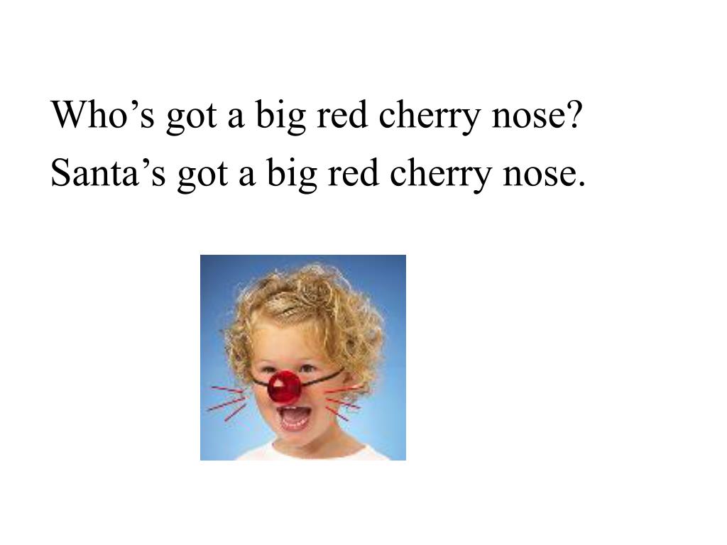 Who’s got a big red cherry nose? Santa’s got a big red cherry nose.