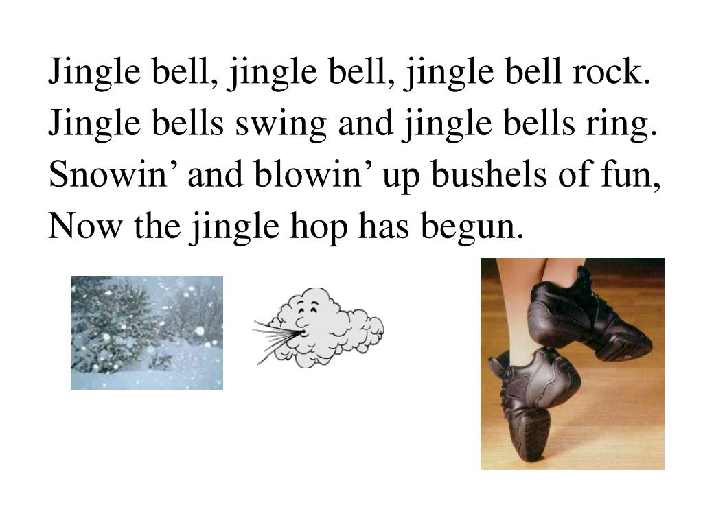 Jingle bell, jingle bell, jingle bell rock. Jingle bells swing and jingle bells ring. Snowin’ and blowin’ up bushels of fun, Now the jingle hop has begun.