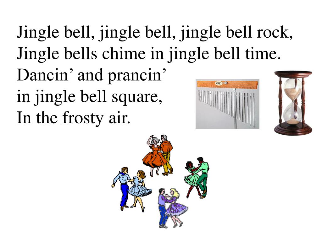 Jingle bell, jingle bell, jingle bell rock, Jingle bells chime in jingle bell time. Dancin’ and prancin’ in jingle bell square, In the frosty air.