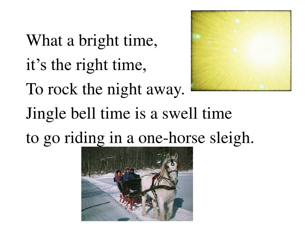 What a bright time, it’s the right time, To rock the night away. Jingle bell time is a swell time to go riding in a one-horse sleigh.