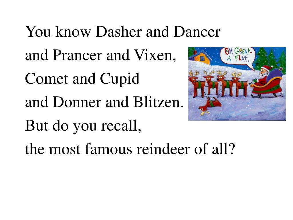 You know Dasher and Dancer and Prancer and Vixen, Comet and Cupid and Donner and Blitzen. But do you recall, the most famous reindeer of all?