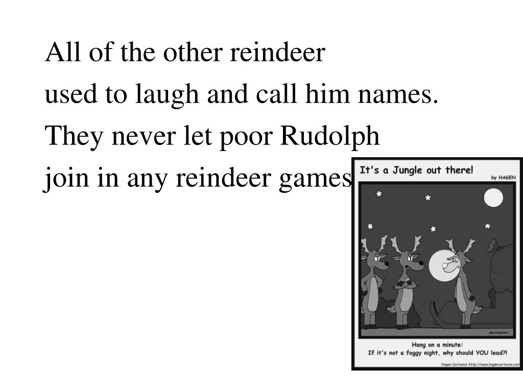 All of the other reindeer used to laugh and call him names. They never let poor Rudolph join in any reindeer games.