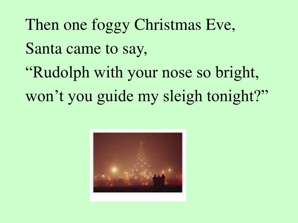 Then one foggy Christmas Eve, Santa came to say, “Rudolph with your nose so bright, won’t you guide my sleigh tonight?”