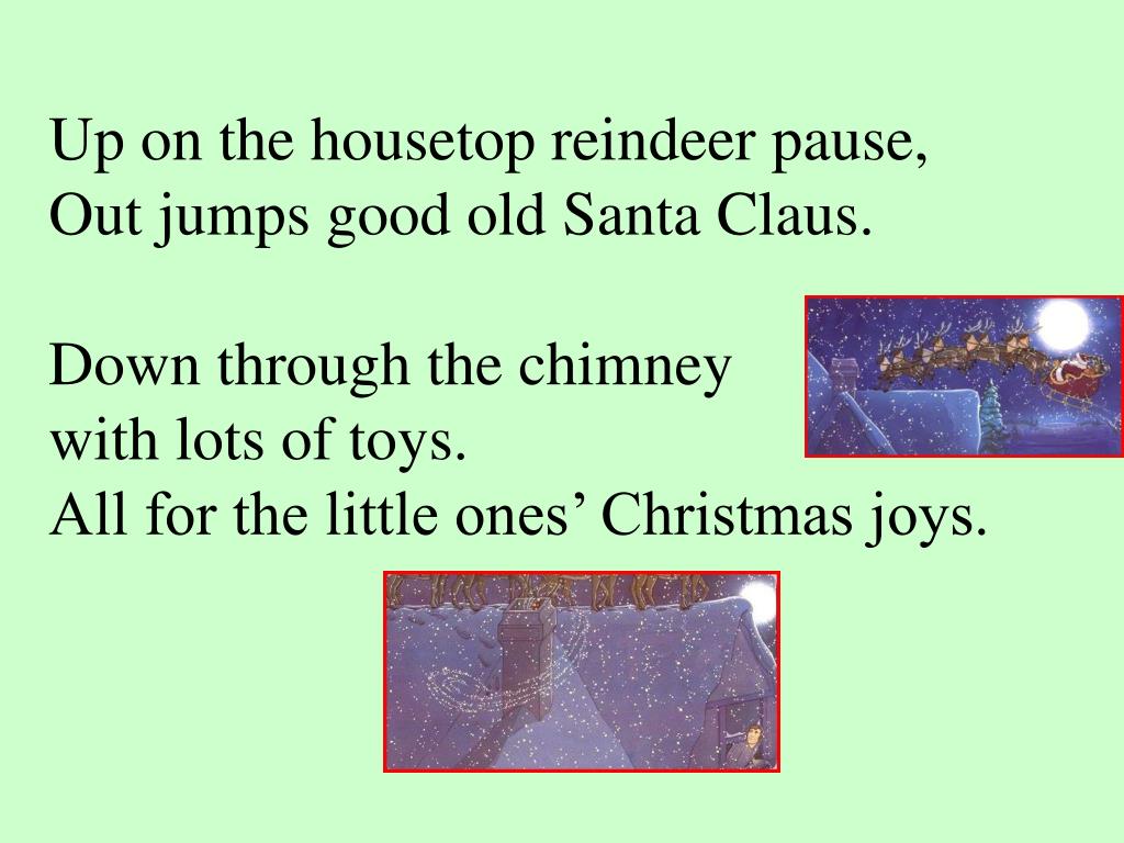 Up on the housetop reindeer pause, • Out jumps good old Santa Claus. • Down through the chimney • with lots of toys. • All for the little ones’ Christmas joys.