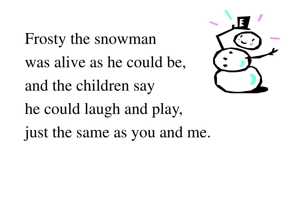 Frosty the snowman was alive as he could be, and the children say he could laugh and play, just the same as you and me.