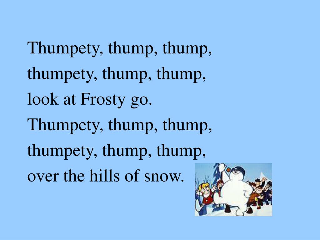 Thumpety, thump, thump, thumpety, thump, thump, look at Frosty go. Thumpety, thump, thump, thumpety, thump, thump, over the hills of snow.