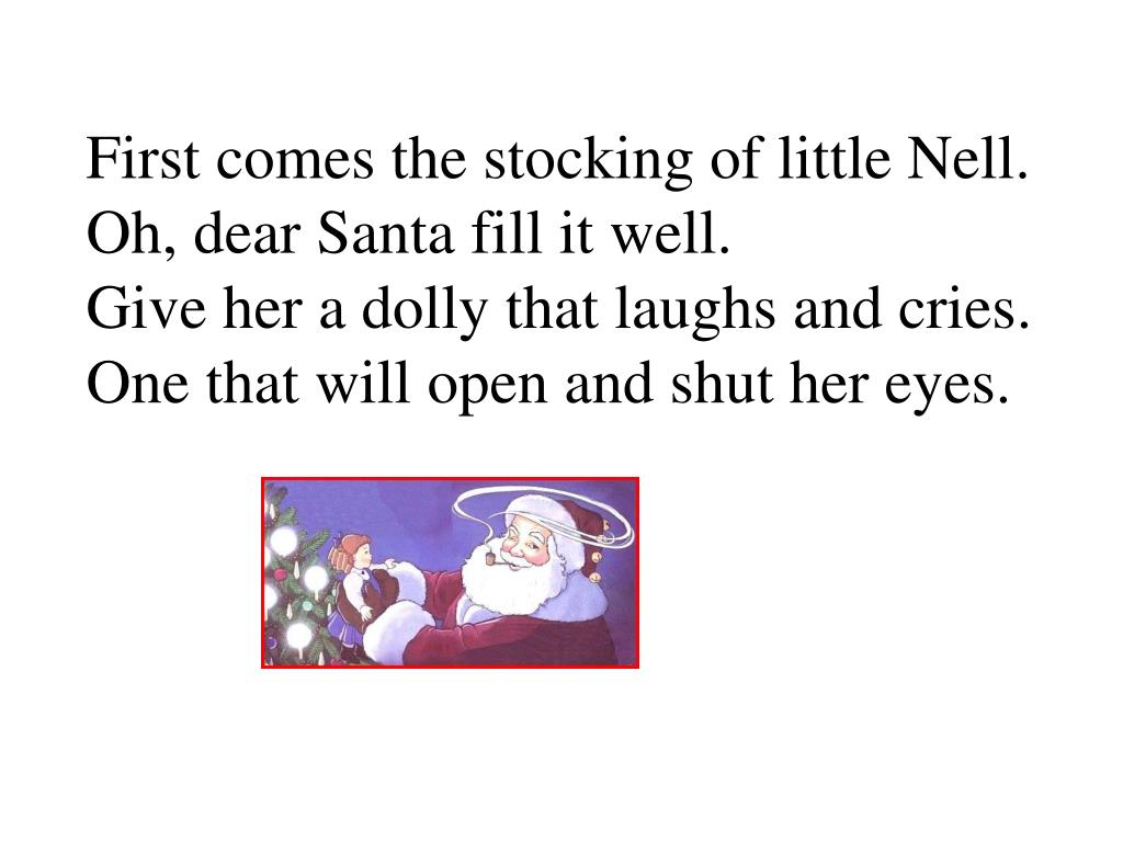 First comes the stocking of little Nell. Oh, dear Santa fill it well. Give her a dolly that laughs and cries. One that will open and shut her eyes.