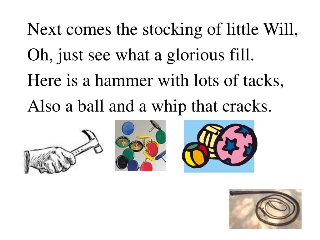 Next comes the stocking of little Will, Oh, just see what a glorious fill. Here is a hammer with lots of tacks, Also a ball and a whip that cracks.