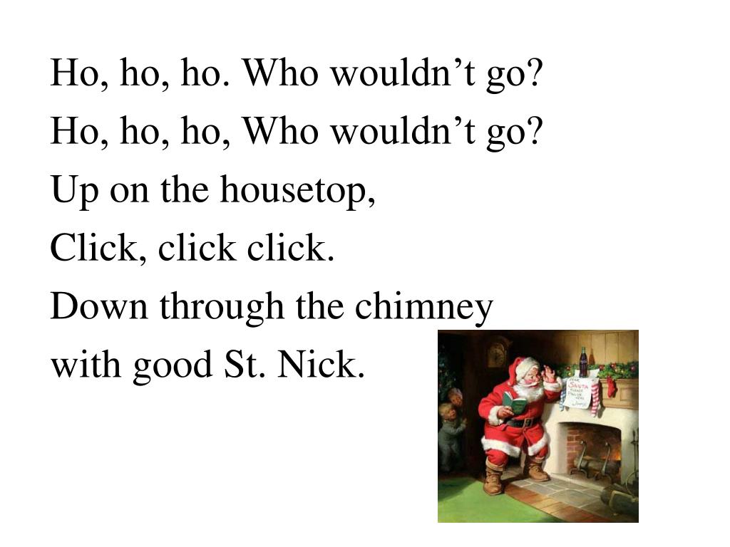 Ho, ho, ho. Who wouldn’t go? Ho, ho, ho, Who wouldn’t go? Up on the housetop, Click, click click. Down through the chimney with good St. Nick.